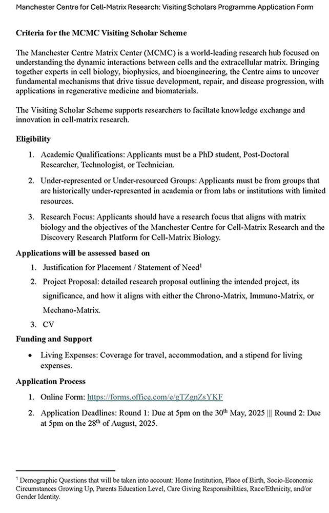 Are you a PhD student or researcher passionate about cell-matrix research? Are you part of a research community that faces barriers to access or opportunity? Our Visiting Scholar Scheme offers short-term research placements at the Manchester Cell-Matrix Centre. Full details attached.
